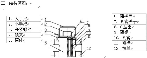 上夾緊螺絲,取出套管蓋部件,然后再抽出磁棒,吸附在套管上的鐵性雜質就能自動脫落。清理后安裝時先把套管裝入筒體內,擰緊夾緊螺絲,然后再把磁棒蓋插入套管內,即可繼續(xù)使用。