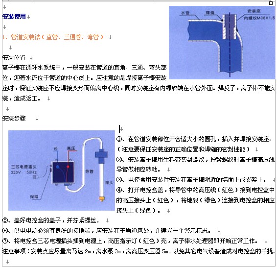 用戶電源應符合儀器說明書上電壓標準,確保地線可靠接地。儀器安裝使用后用戶不能隨意拆卸或調試電控盒。當循環(huán)水系統(tǒng)停止工作時應首先切斷離子棒水處理器電源,在時間允許情況下應清潔探頭。(宜用干凈軟布和清水輕輕沖洗)