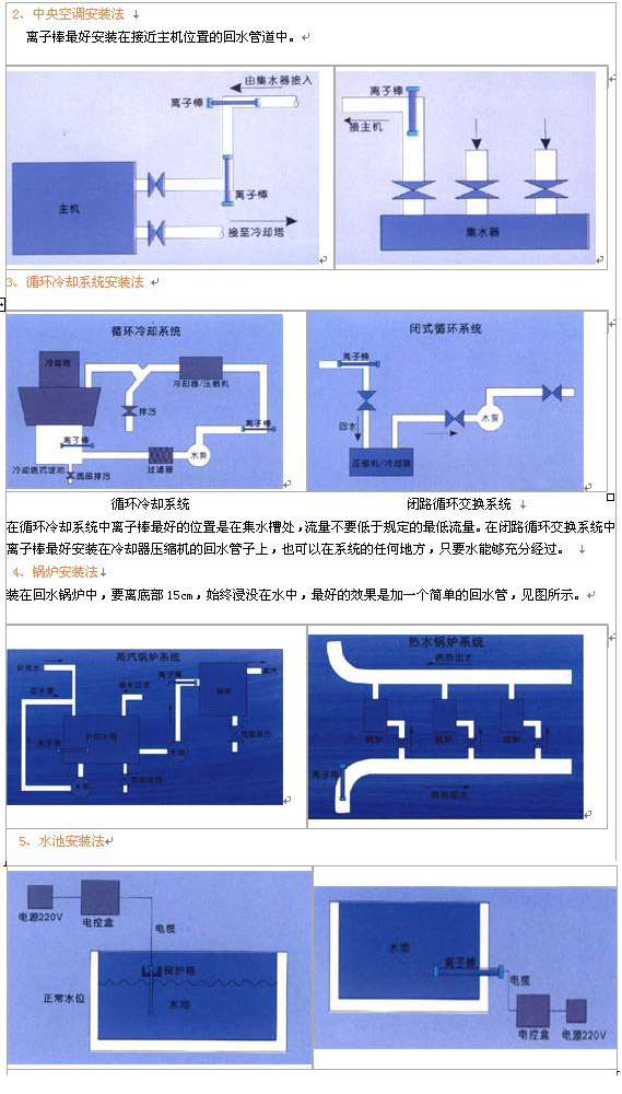 防 垢:離子棒通過高壓靜電場的直接作用,改變水分子中的電子結構,水偶極子將水中陰、陽離子包圍,并按正負順序呈鏈狀整齊排列,使之不能自由運動,水中所含陽離子不致趨向器壁,阻止鈣、鎂離子在器壁上形成水垢,從而達到防垢目的。