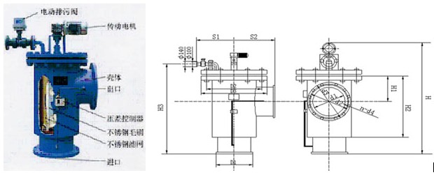 全自動(dòng)刷式過(guò)濾器其內(nèi)部結(jié)構(gòu)為豬鬢毛刷及不銹綱絲刷及不銹鋼濾網(wǎng)和傳動(dòng)件組成,有傳動(dòng)電機(jī)和電動(dòng)閥自動(dòng)完成清洗排污,操作方式為自動(dòng)運(yùn)行(亦可手動(dòng)運(yùn)行),具有壓差和定時(shí)自動(dòng)排污雙重功能。其自動(dòng)化部分采用當(dāng)今世界最先進(jìn)最可靠的PLC可編程控制器。當(dāng)水流經(jīng)過(guò)過(guò)濾器時(shí),水中的機(jī)械雜質(zhì)被過(guò)濾網(wǎng)攔截,當(dāng)濾網(wǎng)表面積聚的雜質(zhì)增加而使壓差達(dá)到0.04MPa時(shí),壓差開(kāi)發(fā)即發(fā)出信號(hào),同時(shí)PLC即發(fā)出指令,傳動(dòng)電機(jī)啟動(dòng),排污閥打開(kāi),沉積在濾網(wǎng)中的雜質(zhì)被轉(zhuǎn)動(dòng)的刷子刷下,從排污口排出,整個(gè)刷洗排污過(guò)程無(wú)須人員操作,無(wú)需停機(jī),同時(shí),該設(shè)備還設(shè)有定時(shí)清洗排污和手動(dòng)清洗排污功能,保證在任何情況下出水的安全可靠。